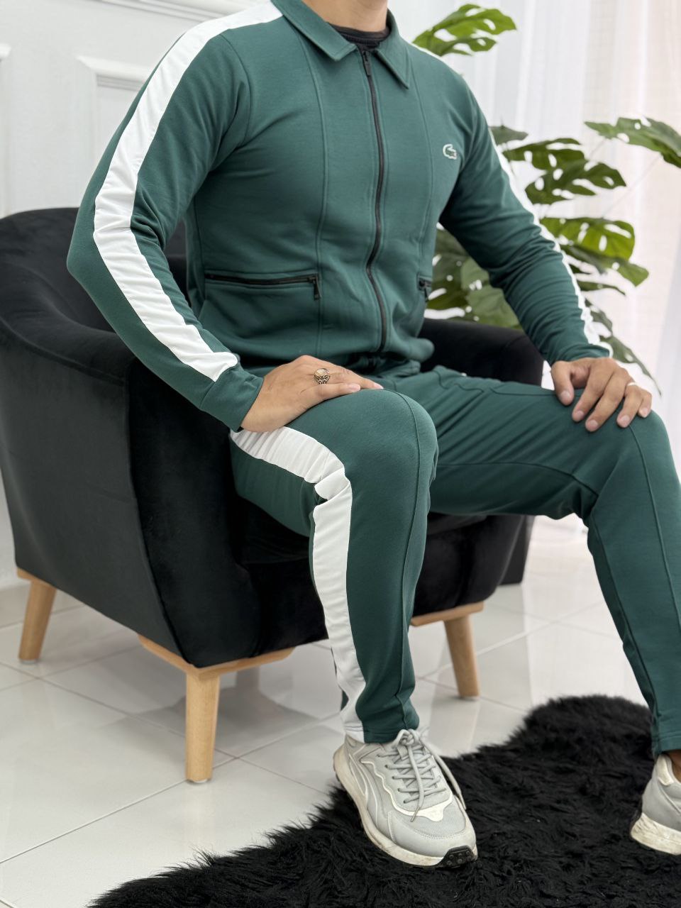 ارتقي بإطلالتك مع هذا الطقم الرياضي العصري باللون الأخضر الداكن مع خطوط جانبية باللون الأبيض 🤍💚، تصميم مميز يمنحك راحة وأناقة في نفس الوقت.
